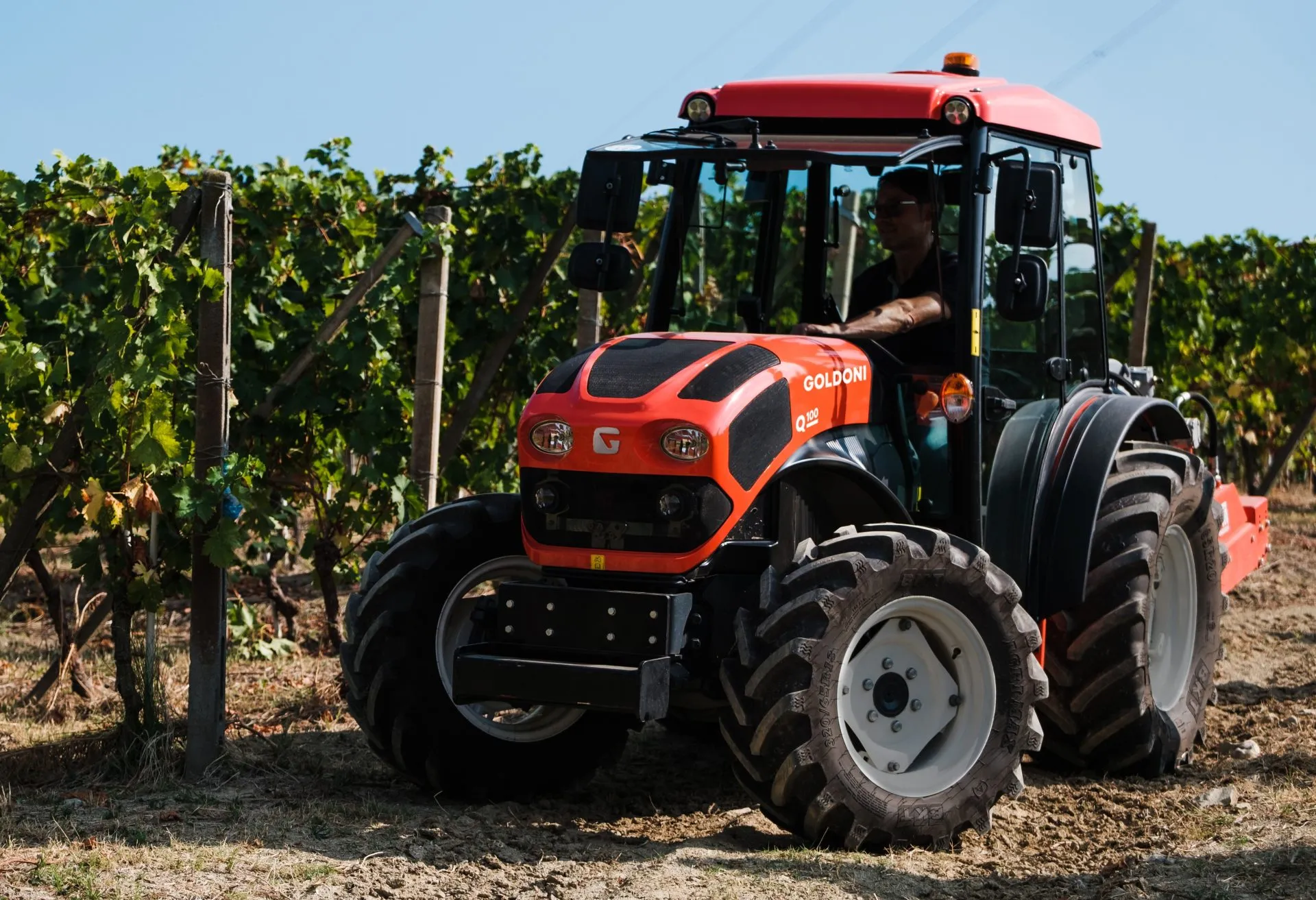 Goldoni Q80 (Stage V) je visoko zmogljiv specializiran traktor z močjo 75KM, zasnovan za delo v vinogradih, sadovnjakih in na strmih terenih. Njegova robustna konstrukcija, nizko težišče in kompaktnost omogočajo odlično stabilnost in okretnost tudi v najzahtevnejših nagnjenih pogojih.